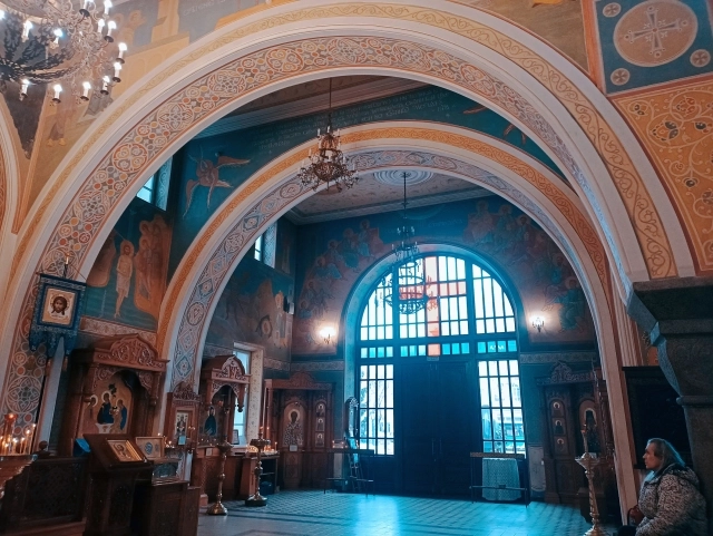 «Внутри практически ничего не осталось от первого Архиерейского дома, за исключением кирпичей, частей напольной плитки и фрески над иконостасом, — рассказывает Тюрина. — Это фреска Спаса Нерукотворного, икону держат два ангела. Её стиль сильно отличается от остальной росписи, которая выполнена в византийской манере. Именно она показывает, как был когда-то расписан Архиерейский дом».