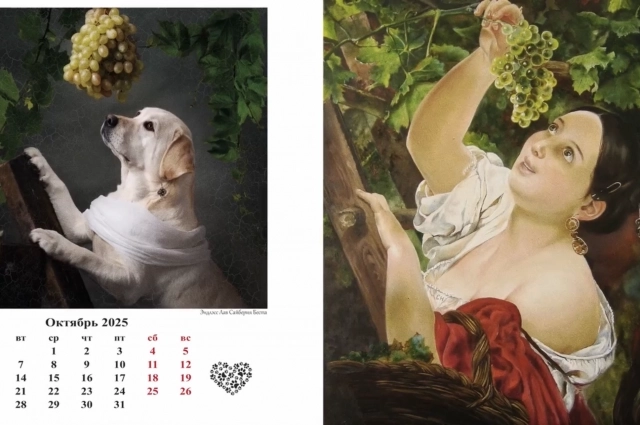 Одна из самых креативных съёмок с лабрадорами — по мотивам известных картин. Елена поклонница живописи, поэтому на кадры её вдохновили работы художников, например, Карл Брюллов и его «Итальянский полдень».