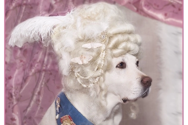 Для образа «Купчиха, пьющая чай» для лабрадора Бесты специально шили жабо. Фото: Из личного архива/ Елена Баврина