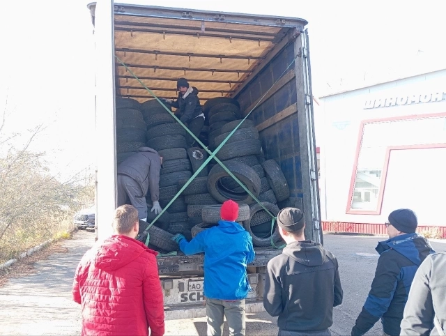 Из Железногорска отправили две фуры по 20 тонн, в которые поместилось 2 тыс. покрышек.