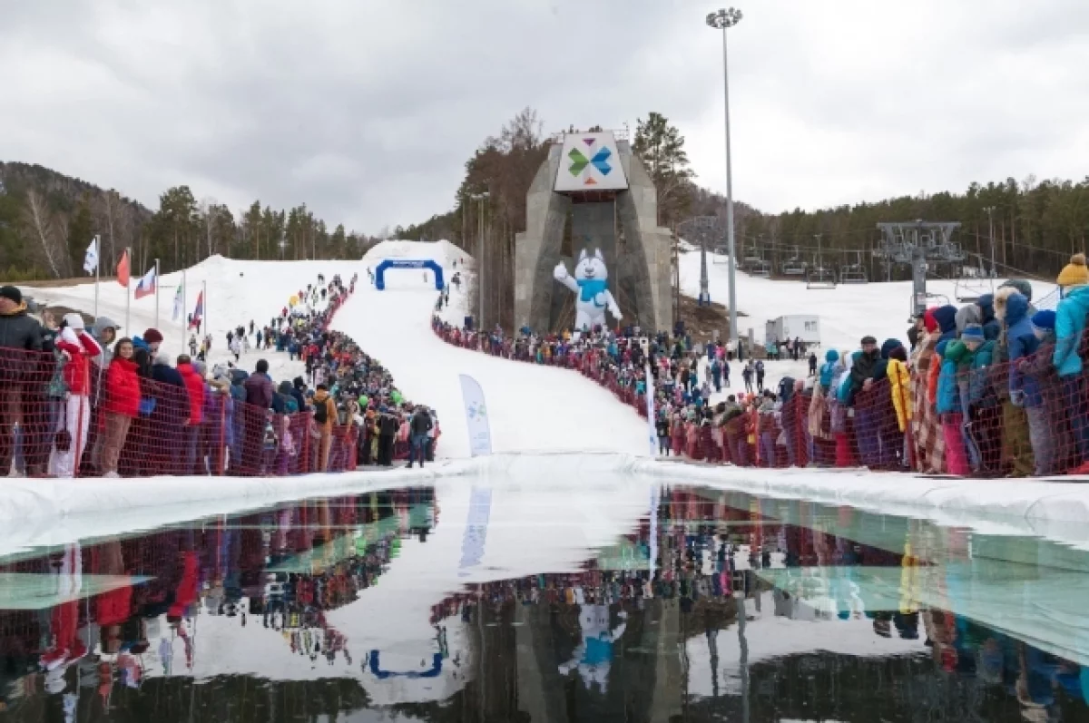 В красноярском фанпарке «Бобровый лог» 19 апреля 2026 в 16-й раз пройдёт Зимний Горнолужник — шуточные соревнования на лыжах и сноубордах с преодолением 25-метровой ледяной лужи. На создание «лужи» уходит до 400 кубометров снега и 150 кубометров воды.